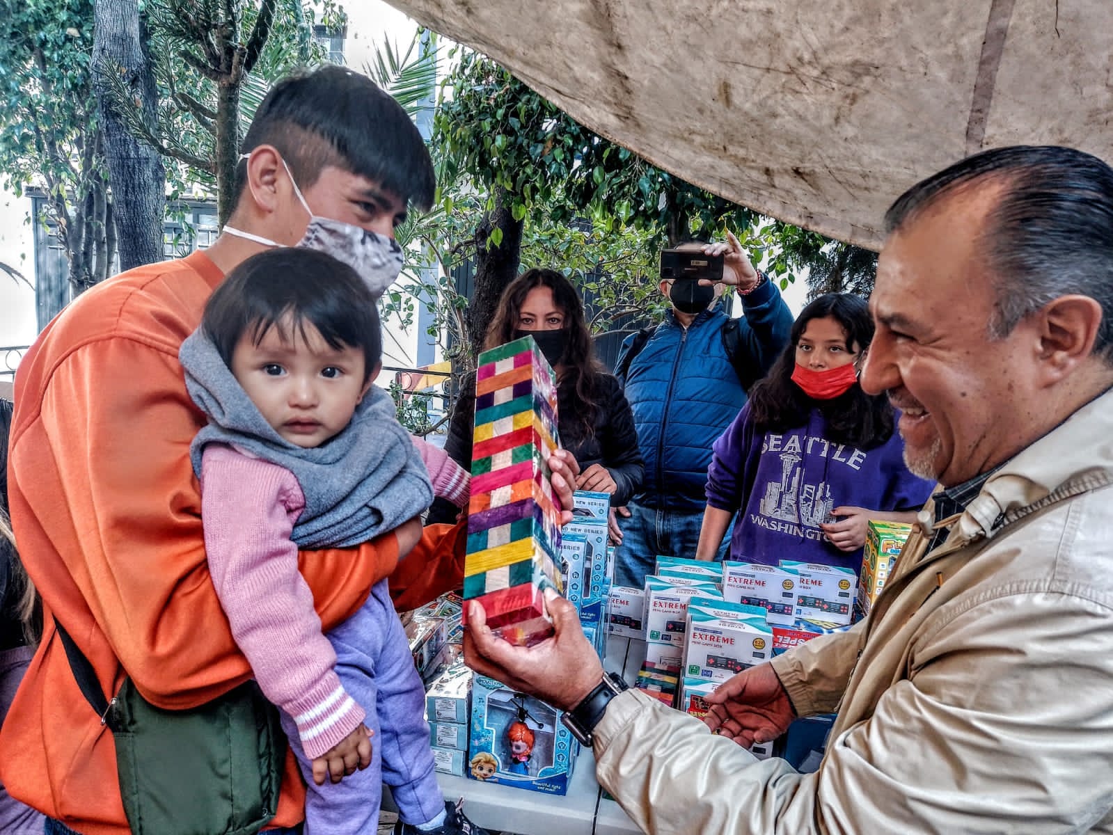 Por la mañana, en el Barrio Los Reyes, Pablo Trejo también hizo felices a niñas y niños con la entrega de juguetes. Los infantes formaron una larga fila y esperaron pacientemente para recibir su obsequio.